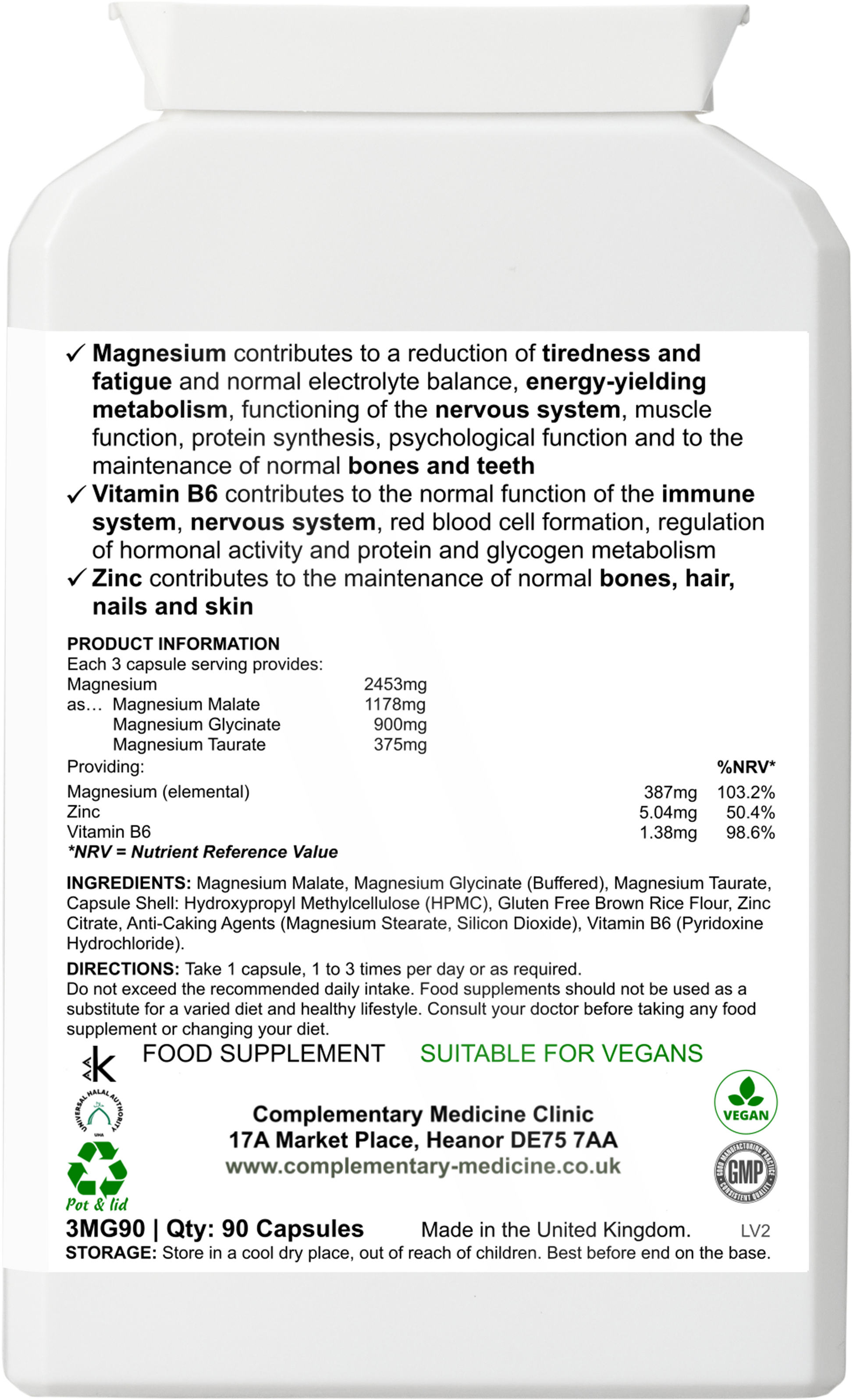 Magnesium Malate, Magnesium Glycinate (Buffered), Magnesium Taurate, Capsule Shell: Hydroxypropyl Methylcellulose (HPMC), Gluten Free Brown Rice Flour, Zinc Citrate, Anti-Caking Agents (Magnesium Stearate, Silicon Dioxide), Vitamin B6 (Pyridoxine Hydrochloride).