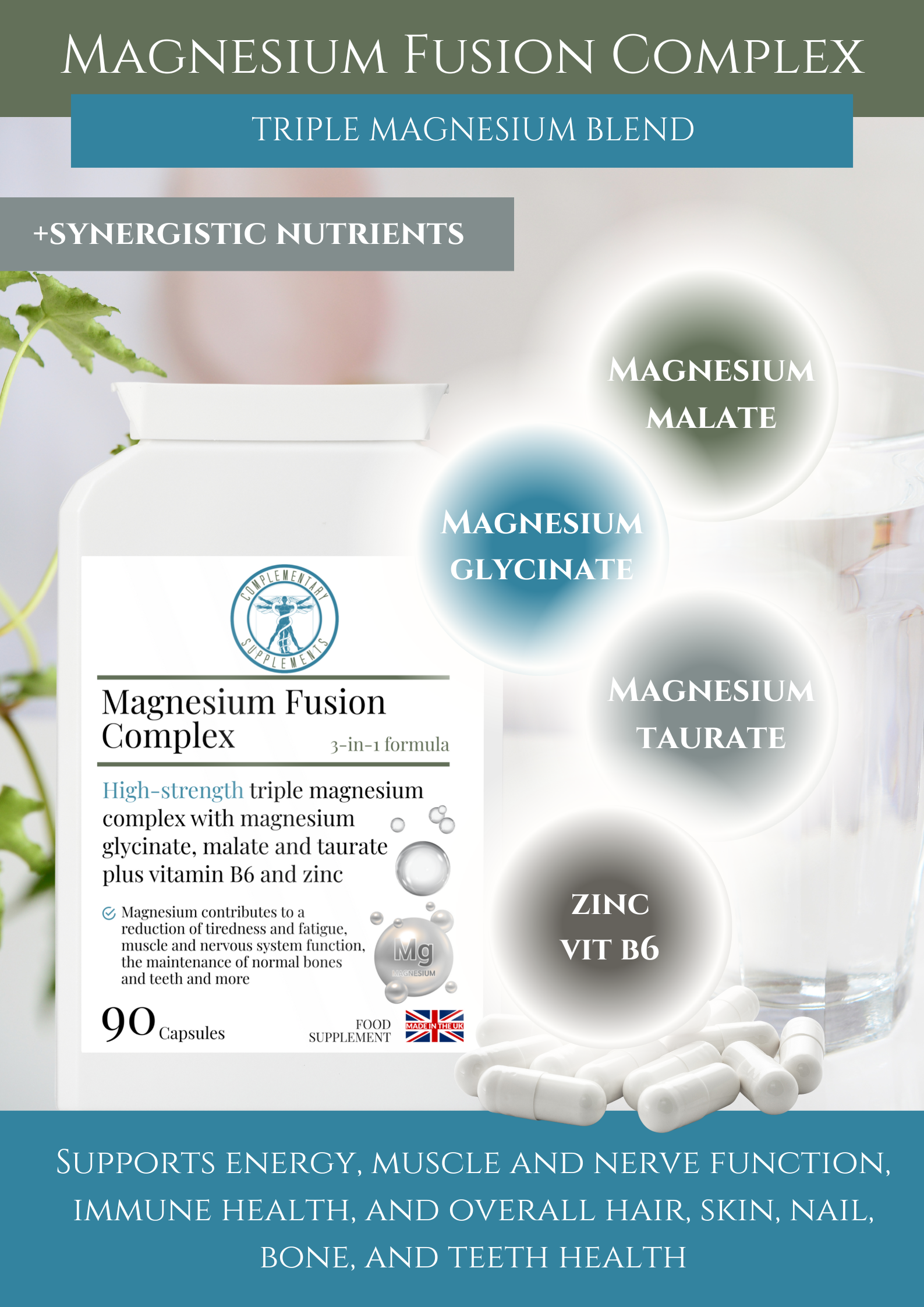 Magnesium Fusion Complex provides a balanced blend of three well-absorbed forms of magnesium: glycinate, malate and taurate. This combination supports normal energy levels, muscles, nerves, and psychological function as part of a varied and balanced diet. Vitamin B6 and zinc complete the formula by supporting normal cognitive function, immune function, and overall nutritional balance.
